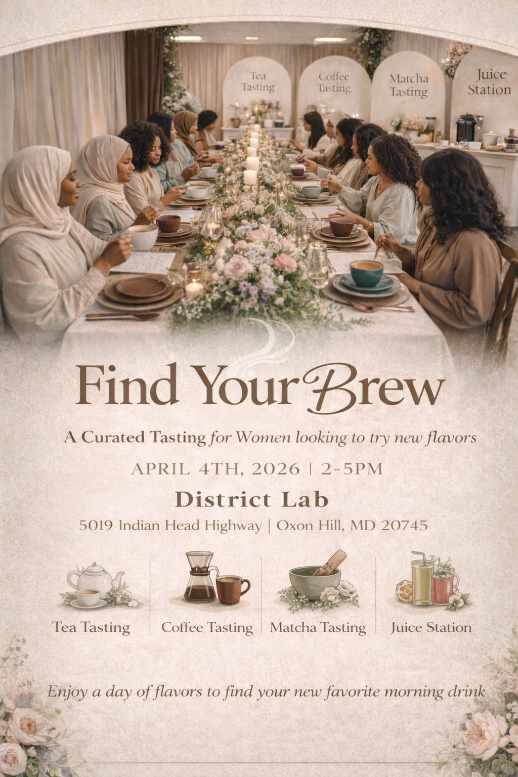 Don't want to Commit to the guided tasting. No worries — still RSVP and come enjoy the vibes. Doors open at 2:00 PM. Guided session runs 2:15–1:15 PM, and the open tasting stations are available from 1:30–4:30 PM. How cute is it to sample different brews, snack on pastries, shop the vendor market, snap cute photos, and even build your own flower bouquet for the week. Whether you come for the education or just the experience, there’s something waiting for you. 🌿☕🌸